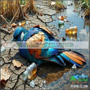 Toxic chemicals coat seeds, contaminate habitats, and bioaccumulate through prey, weakening immune systems.