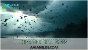 - You’ll notice birds face increasing challenges during migration, including predation, harsh weather, light pollution, and critical habitat loss that threatens their carefully evolved migration routes and stopover sites.