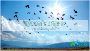 - You’ll find that birds don’t just rely on instinct—they navigate using sophisticated methods including celestial cues, Earth’s magnetic field, visual landmarks, and innate direction sense built into their genetic makeup.
