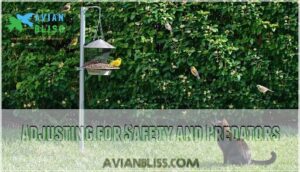 You’ll want predator deterrents like squirrel guards to protect your bird feeder, ensuring hawk prevention and raccoon control, while also using cat deterrents for overall predator protection and bird feeder safety tips to achieve predator avoidance with squirrelproof feeders.