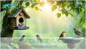 You’ll want to place bird feeders 3-10 feet from windows and 10 feet from trees to minimize collisions and predator access, ensuring a safe haven for birds to feed and thrive.
