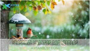 You’ll want to make seasonal adjustments to guarantee that your feeder remains a safe and welcoming spot for birds throughout the year, considering the changing seasons.