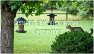 Position your bird feeder placement 10-15 feet from dense cover to prevent predator ambushes while allowing quick escapes.