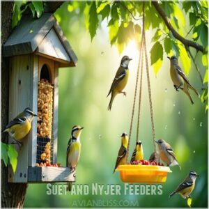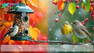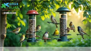 Position feeders near shrubs but with clear sight lines to avoid predator ambushes. You’ll want to maintain clean feeders weekly—a simple soap-and-water scrub prevents disease spread.