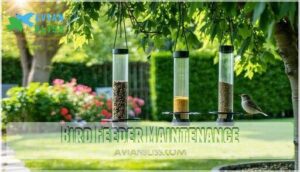 Effective bird feeder maintenance involves using a reliable feeder cleaner tool to guarantee the feeders are free from debris and bacteria. This ensures a healthy environment for the birds, promoting a thriving feeding station.