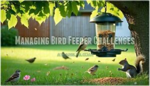 You’ll encounter persistent squirrels raiding feeders and contaminated seed that threatens bird health, but these problems have straightforward solutions.