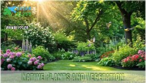 You’ll transform your yard into a thriving bird habitat by incorporating native plants that provide natural food sources and essential shelter throughout the seasons.