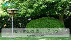 Position these bird shelters within ten feet of feeders but away from your bird bath, as even squirrel proof setups benefit from nearby perching spots in bird friendly gardens.