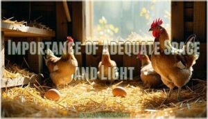 Follow space requirements—about 2-3 square feet per bird. Natural sunlight boosts laying, but shorter days need artificial light for chickens, ensuring 14 hours daily.