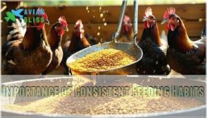 Consistent feeding habits are key for balanced nutrition and predictable production in chicken egg laying.