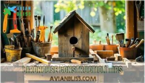 You’ll need to ponder materials like zinc-plated hooks and hinges, outdoor paint, and exterior wood screws and nails to guarantee your birdhouse is durable and well-constructed.