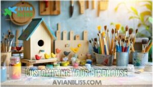 You can personalize your birdhouse with themed designs, like fairy-tale castles or superhero hideouts, using weather-safe paints and natural decorations, making it a unique character house that stands out with creative color palettes and decorative elements.