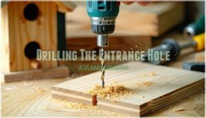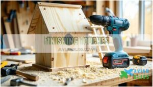 A clear, non-toxic oil-based finish protects without harmful chemicals. These basics form your foundation, but choosing the right entrance hole size and proper ventilation can make or break your bird attraction success.