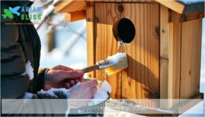 To make it winter-ready, choose a sturdy wooden design with thick walls for insulation. Add a small door to keep drafts out and consider a rough interior surface to help birds grip.