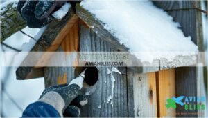 Scrub all surfaces thoroughly to guarantee proper birdhouse sanitation. While you’re at it, inspect for cracks or damage to guarantee birds feel secure.