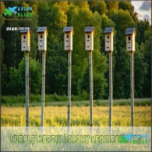 Place each house at least 60 feet apart for proper gourd spacing. Face entrances away from winds, guarantee predator control, and provide clear flyways to attract this social bird species, ensuring a suitable environment for social bird.