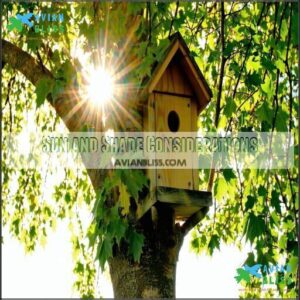 Consider birdhouse sunlight needs and shade requirements, balancing morning warmth with some coverage to keep them comfortable.