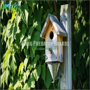 Install predator guards below the birdhouse using sturdy materials like metal for durability.