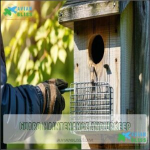 You’ve kept your birdhouse predator guard spotless, which means it’s time to focus on cleaning and repairs. Debris removal is your first step—brush off leaves and dirt to prevent material degradation. For rust prevention, use steel wool on metal guards, then apply protective coating.