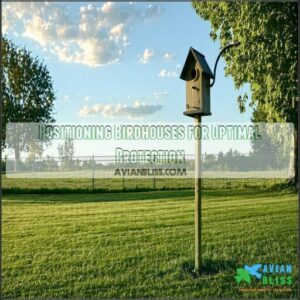 Position your birdhouse in open areas, 10 feet from climbing hazards, maximizing predator guard effectiveness while maintaining proper placement for your feathered tenants’ specific needs, ensuring a safe and welcoming birdhouse.