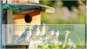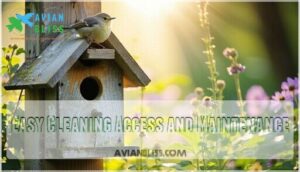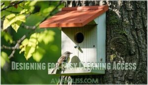 Think of cleaning access like a sneak peek behind the scenes—it’s essential for birdhouse maintenance.
