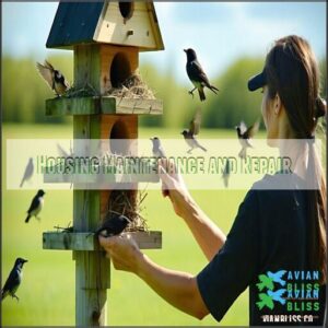 Regular bird housing cleaning should include nesting material removal after each season—this prevents pests and illness. During bird housing inspection, check for structural issues like cracks or loose floors.