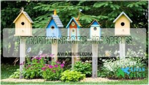 To attract specific bird species, you’ll need to match the birdhouse design and placement to their unique nesting habits.
