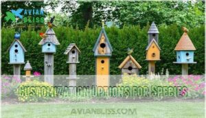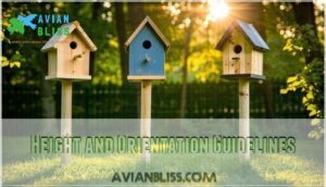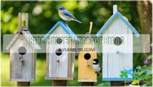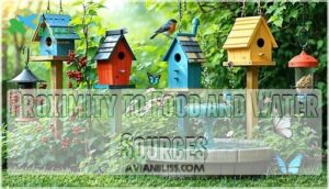 Placement’s vital too—set birdhouses five to ten feet off the ground in quiet areas, away from predators and busy walkways.