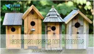 Use wood for its natural insulation, like cedar or pine, ensuring proper birdhouse dimensions fit specific species.