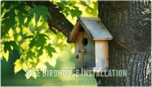 You’ll want to install birdhouses securely to guarantee the safety of their feathered occupants and prevent predator access.