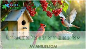 - To attract cardinals to your birdhouse, offer the right food, like sunflower seeds, and provide a water source, and place the house in late winter to prep for breeding season, ensuring shelter from elements and resource availability.