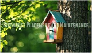 You’ll want to place your cardinal birdhouse near dense vegetation, like shrubs or thickets, for predator protection and nesting materials, while considering visibility concerns and weather exposure, to create a safe haven for Northern cardinals.