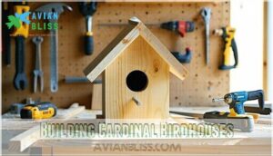 You’re building a cardinal birdhouse, and to guarantee durability, use the right materials, like exterior-grade plywood or cedar.