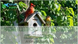 - When placing a cardinal birdhouse, consider the ideal elevation, typically 5-10 feet above ground, and position it near vegetation for proximity and protection from weather exposure.