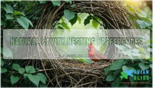 You’ll find cardinals prefer natural foliage for nesting, typically 1-2 meters off the ground, using twigs and leaves as nest materials.