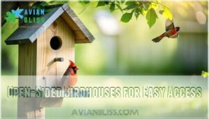 You’ll want to select a birdhouse that’s open-sided, allowing for easy access, and avoid traditional round-hole birdhouses that aren’t suitable for cardinals.