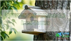 Choose durable materials and consider location carefully to protect from harsh weather and birdhouse predators, ensuring a weather-resistant birdhouse with ideal birdhouse placement for a safe and cozy cardinal home.