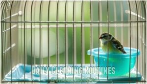 Think of daily cleaning routines as your bird’s lifeline – they prevent deadly bacteria buildup that kills countless pets yearly.
