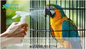 - Use proper disinfection methods – Apply diluted household bleach (1 cup per gallon of water) or commercial bird-safe disinfectants monthly, then rinse thoroughly to eliminate pathogens without harming your bird’s delicate respiratory system.