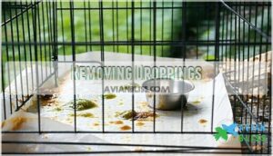 You should clean bird droppings daily to prevent bacteria buildup and maintain your feathered friend’s health.