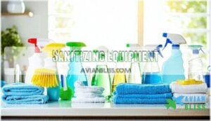 Proper bird cage disinfection starts with choosing the right equipment materials. You’ll need dedicated brushes, cloths, and containers solely for bird cage cleaning to prevent cross-contamination.