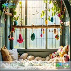 Remove hazards like sharp edges, damaged toys, and unsafe plants. Use soft bedding and bird-friendly perches for comfort.