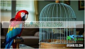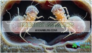 While you’re inspecting your budgie’s beak for mite identification, scaly face mites burrow beneath the skin, creating crusty growths that can cause serious beak deformities if left untreated.