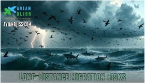 Migration is risky, with threats like predators, habitat loss, and weather extremes.