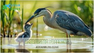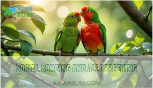 You’ll discover that preening isn’t just about feather maintenance, as birds use this behavior to strengthen social bonds, communicate with flock members, and establish their place in the pecking order.
