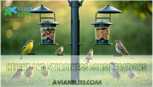 You’ll want a sturdy bird feeding station that’s 6-8 feet tall with solid ground anchoring for ideal pole stability.