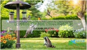 You’ll need poles over six feet tall with secure mounting systems that prevent raccoon climbing altogether. You can find specialized raccoon solutions for purchase online.
