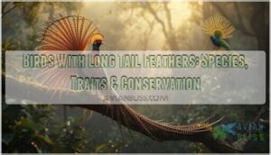 You’ll encounter stunning examples like the Indian peafowl’s ornate train, Reeves’s pheasant with exceptionally long tail feathers, resplendent quetzal’s iridescent plumes, and greater bird-of-paradise displaying elaborate extensions during mating rituals.