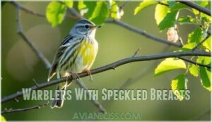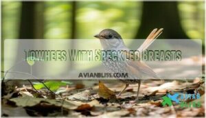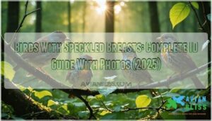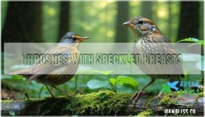 You’ll find several thrush species that display beautiful speckled breast patterns, with the varied thrush and hermit thrush being the most common examples you’re likely to encounter.