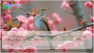 You’ll find that songbirds with speckled breasts are among the most melodious birds in your yard, with the brown thrasher leading the pack as nature’s champion vocalist.